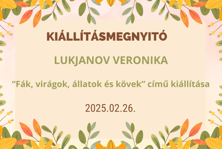 Események Kiállításmegnyitó - Lukjanov Veronika: Fák, virágok, állatok és kövek című kiállítása 2025. február 26., szerda @ 00:00 Megosztás